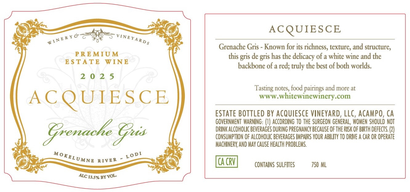The black skinned variant of Grenache, of course, is utilized the world over to produce both red wines and rosés. Reds, however, are not Acquiesce’s schtick; although the estate’s unerringly talented winemaker, Christina Lopez, has made a few laudably sleek, pure and zesty Grenache-based reds in recent vintages just to show that she can, if she wants to (there are no reds among Acquiesce’s current releases, and there was none produced in 2025).